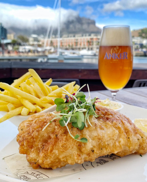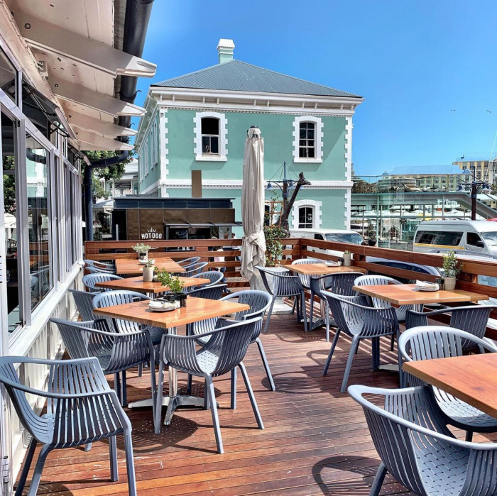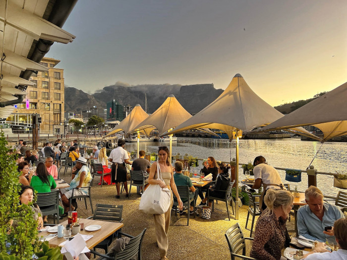 Take an umbrella shaded table on our terrace, at the African Queen bar, or in our streamlined interior, where wall-to-wall windows make the most of the picture - postcard backdrop of Table Mountain.