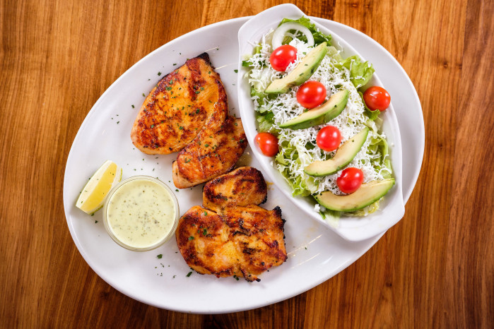 Or Prawns or Grilled Hake or Calamari Served with starch and vegetables. Or Grilled Chicken Breast Served with a Feta, Strawberry and Avo Salad