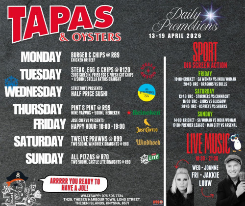 Tapas and Oysters is a vibrant waterside restaurant on Thesen Island with views over the Knysna Lagoon towards the iconic Knysna Heads. We are well known for our great food, friendly service and vibey atmosphere. With a wide selection of Spanish, Mediterranean and South African Tapas, you are bound to find something that tickles your taste buds. In addition to our Tapas menu, we also offer oysters (fresh from our oyster tanks), fresh seafood dishes, homemade dips, pizza, crunchy salads, and desserts. All Tapas dishes are served with our freshly-baked rocket salt baguettes. Don’t forget about our legendary Steak, Egg & Chips, best served with an ice-cold beer available on tap.