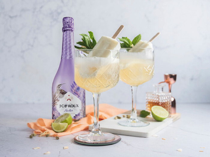 Sweeten your day with the J.C. Le Roux Nectar and gin poptail. This lively Poptail includes a cardamom and coconut popsicle immersed in an elderflower and litchi sparkling infusion, topped with gin.Sunset Rosé (Nectar Demi-Sec Rosé)
