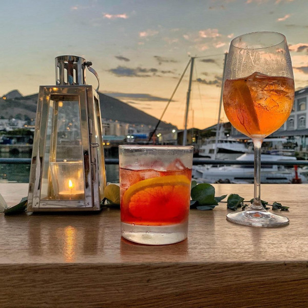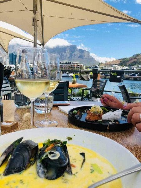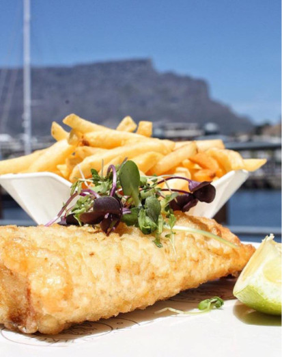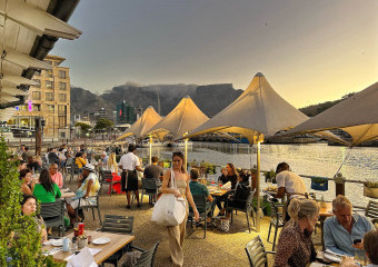 Take an umbrella shaded table on our terrace, at the African Queen bar, or in our streamlined interior, where wall-to-wall windows make the most of the picture - postcard backdrop of Table Mountain.