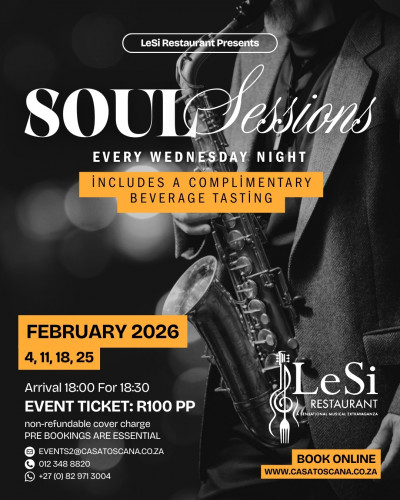 Booking essential at LeSi Restaurant for A-la-carte dinner on these dates.R100 non-refundable cover charge per person, 15% service fee excluded)