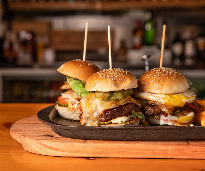 A 3x200g beef patties, topped with cheddar and bacon, fried egg and onion rings served with chips.Ask your waiter for more on the challenge*