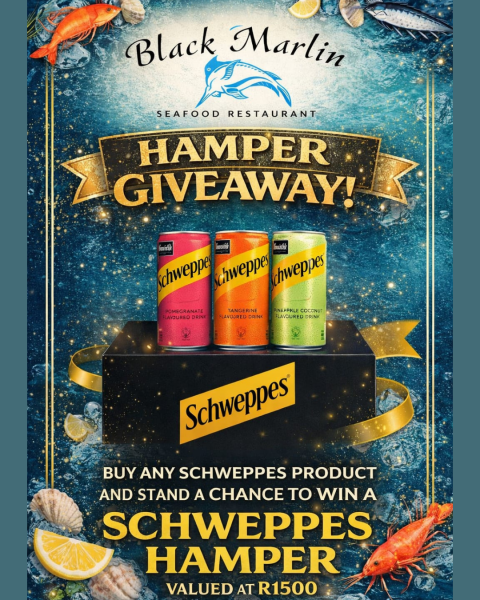 From 01 February 2026 to 14 February 2026, dine at Black Marlin, purchase any Schweppes product, and you’ll automatically stand a chance to win a Schweppes gift hamper worth R1 500!