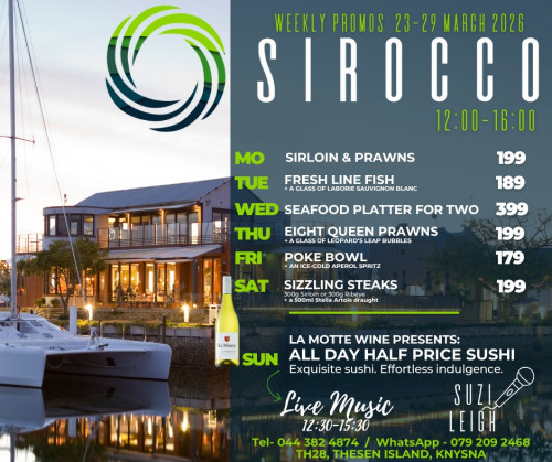 Situated on the water’s edge of Knysna’s trendy Thesen Harbour Town, Sirocco is evocatively named after the warm wind that blows across the Mediterranean. Sirocco is a vibrant meeting place; a lunch and dinner venue for those who appreciate relaxed sophistication, cutting-edge design, friendly service, and great food.