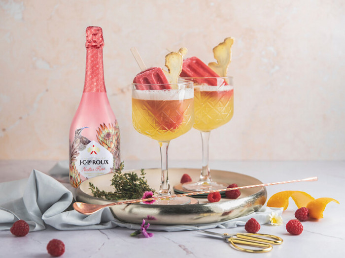 Sweeten your day with the J.C. Le Roux Nectar and gin poptail. This lively Poptail includes a cardamom and coconut popsicle immersed in an elderflower and litchi sparkling infusion, topped with gin.Sunset Rosé (Nectar Demi-Sec Rosé)
